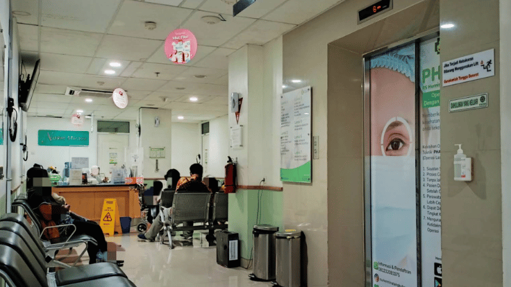 - Bawa terbang lembaran bukti cetak izin periksa ke ruangan lift guna menembus koridor tunggu di deretan bangku ruang poliklinik lantai atas.